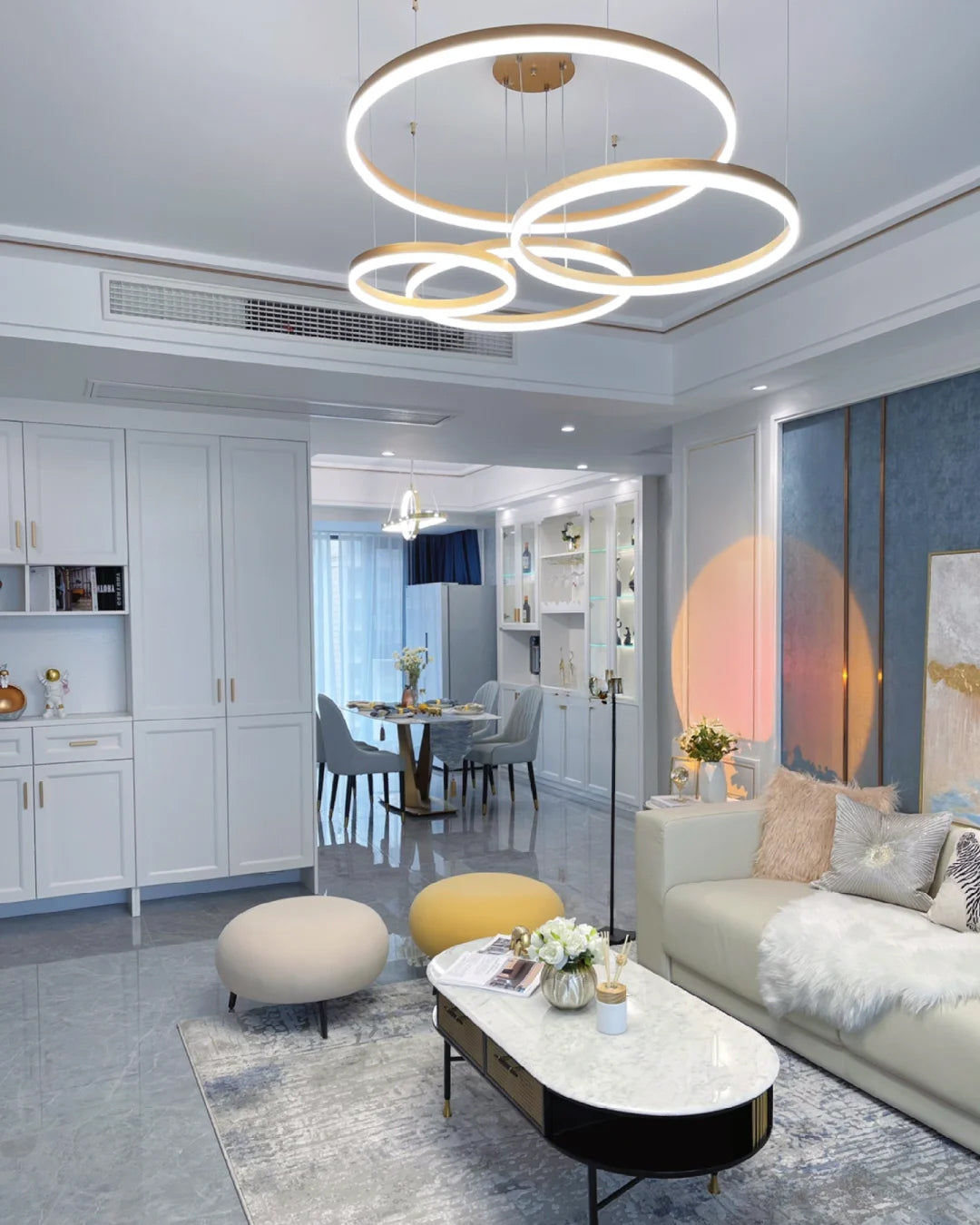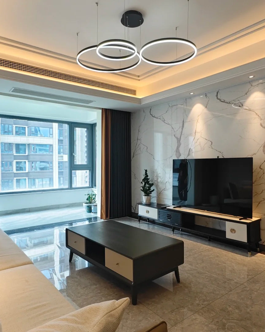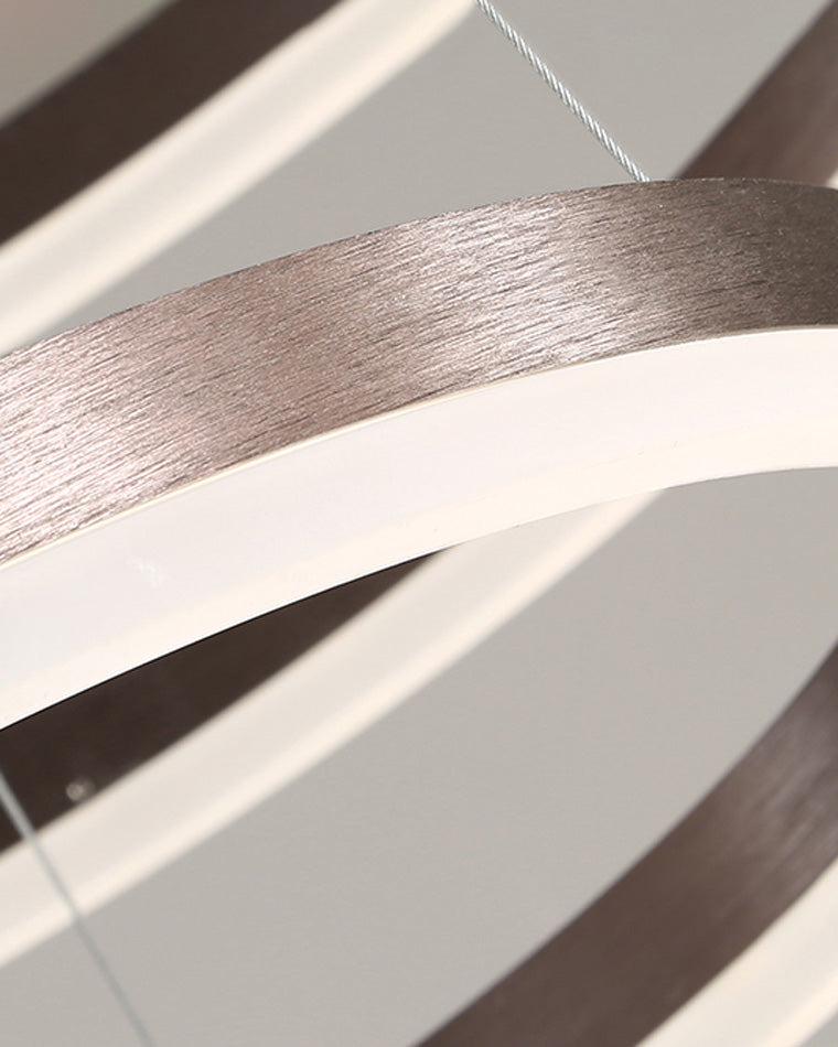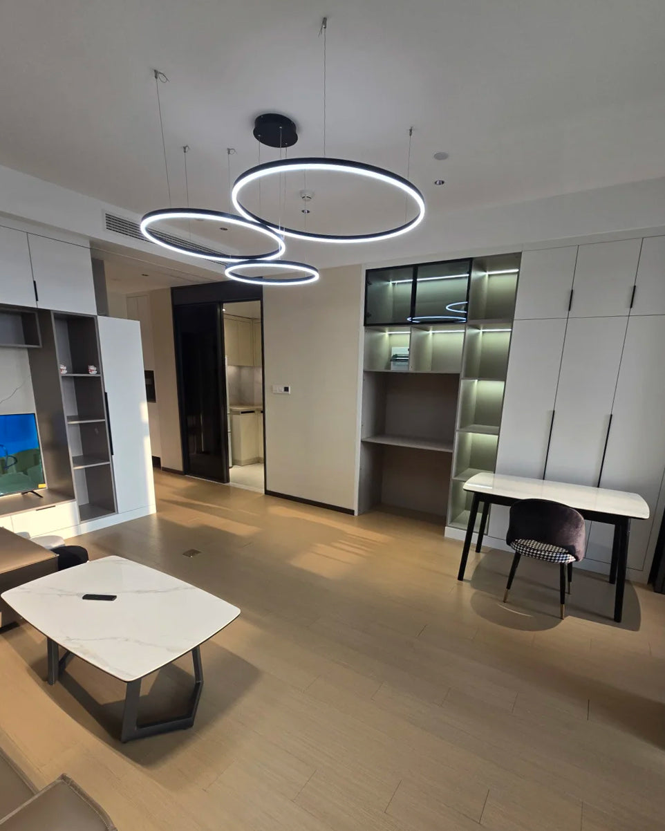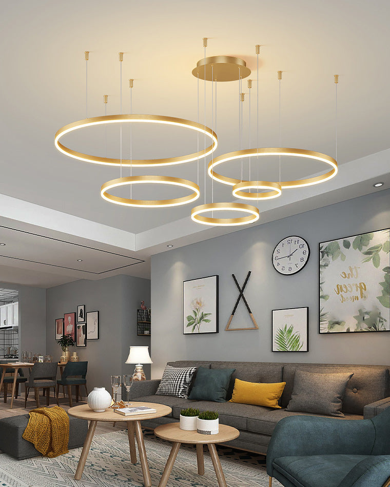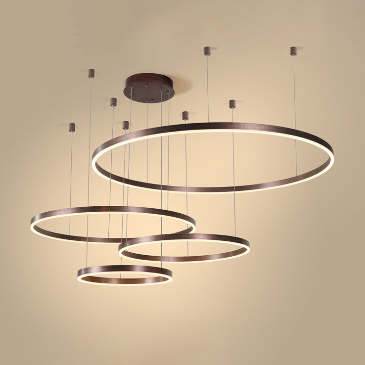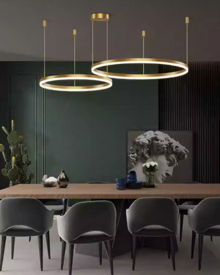 The lights in the pictures are modern circular pendant fixtures with multiple rings suspended from the ceiling. Made of metal with finishes like matte black, brown or gold, the rings are illuminated by integrated LED lights, creating a sleek, glowing effect. These fixtures add a contemporary, geometric touch to any modern space.