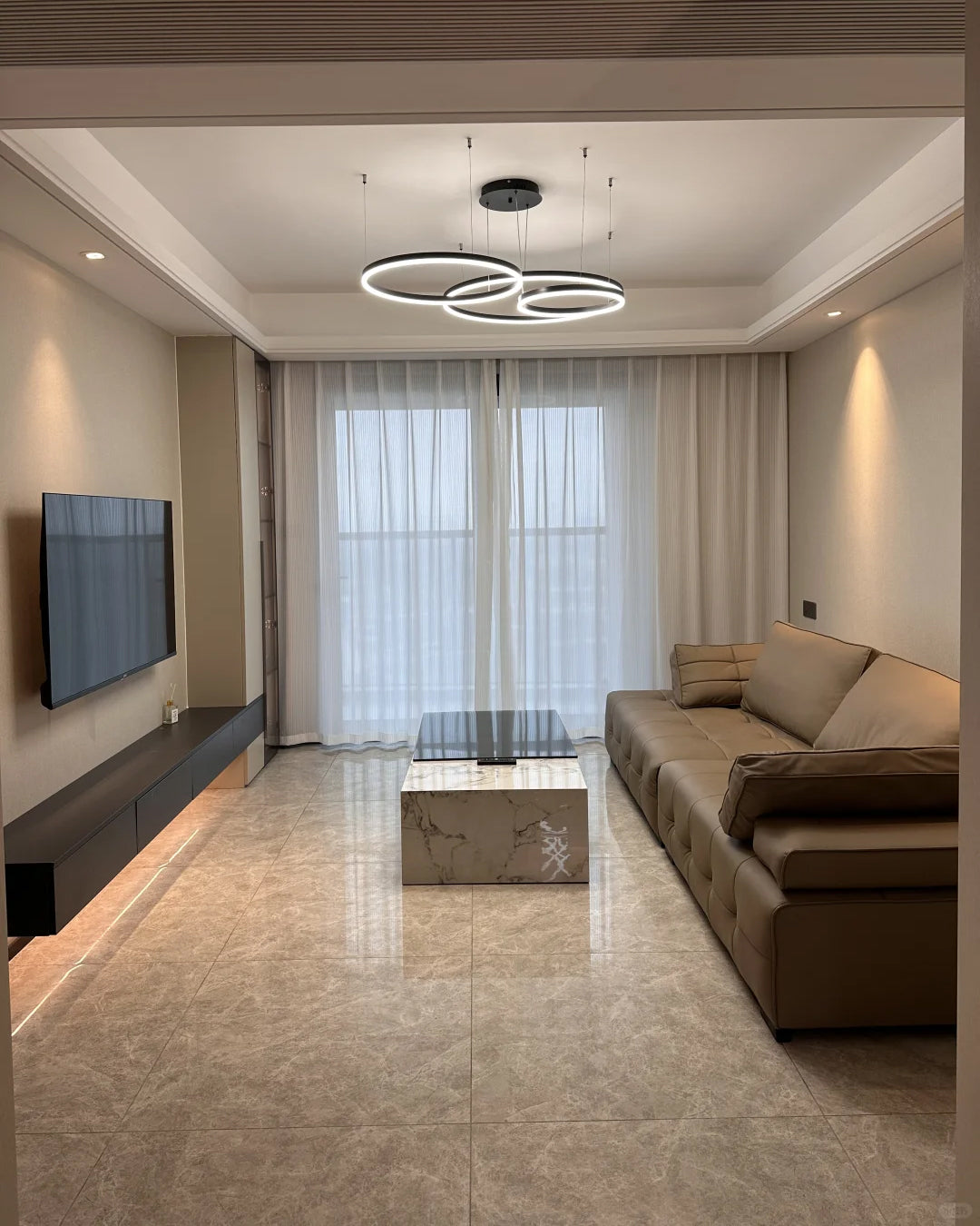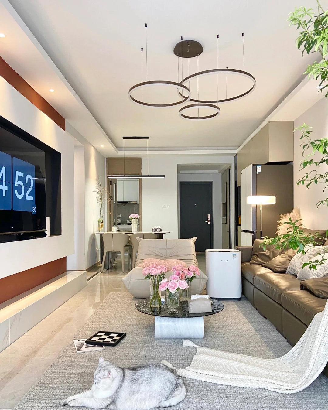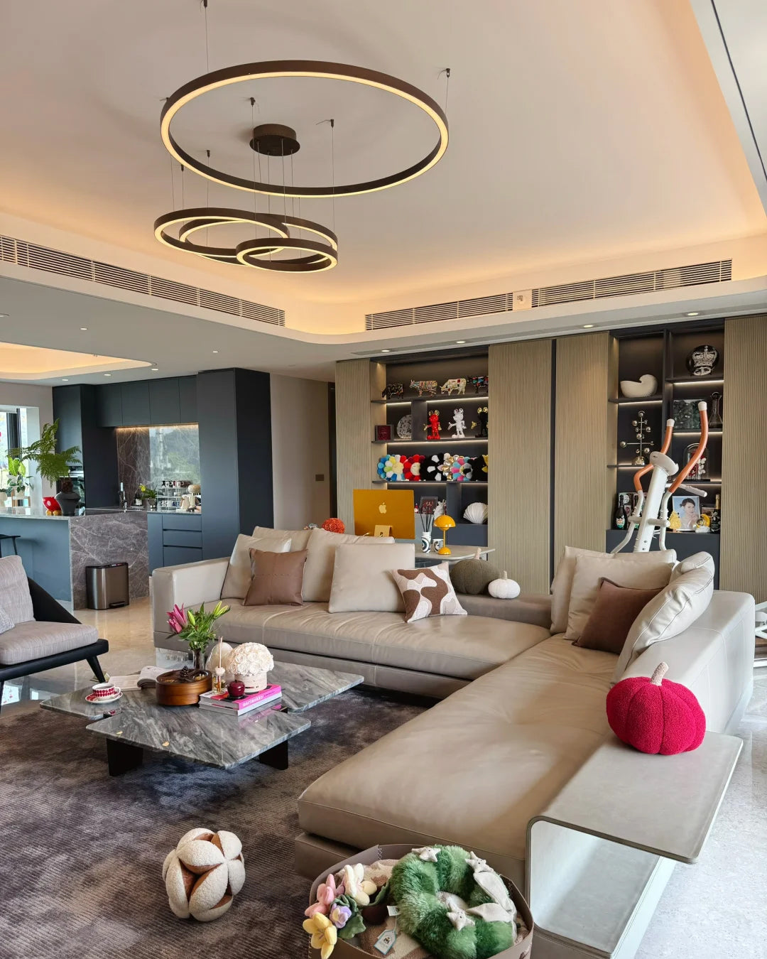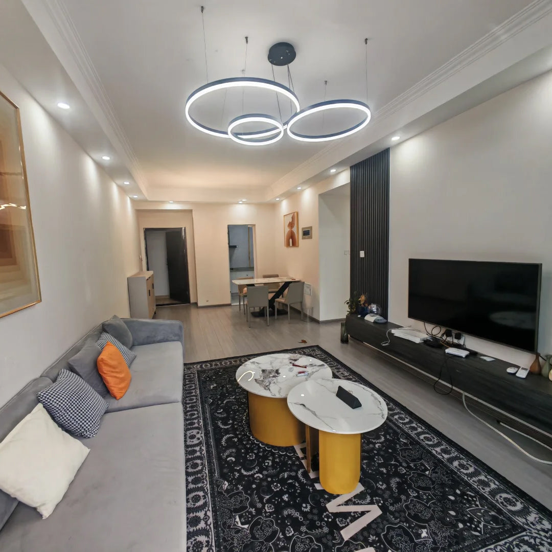 The lights in the pictures are modern circular pendant fixtures with multiple rings suspended from the ceiling. Made of metal with finishes like matte black, brown or gold, the rings are illuminated by integrated LED lights, creating a sleek, glowing effect. These fixtures add a contemporary, geometric touch to any modern space.