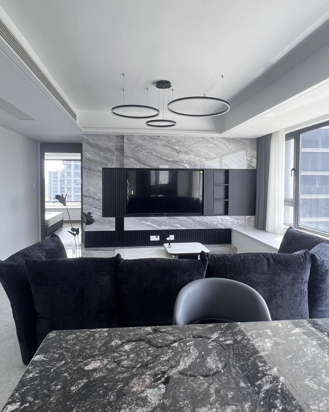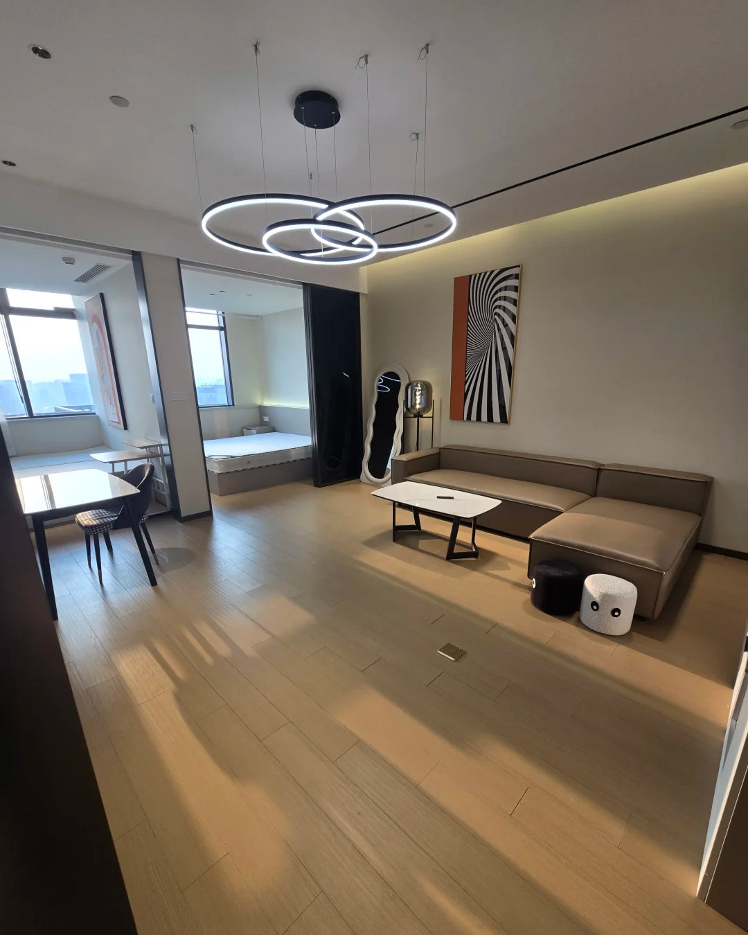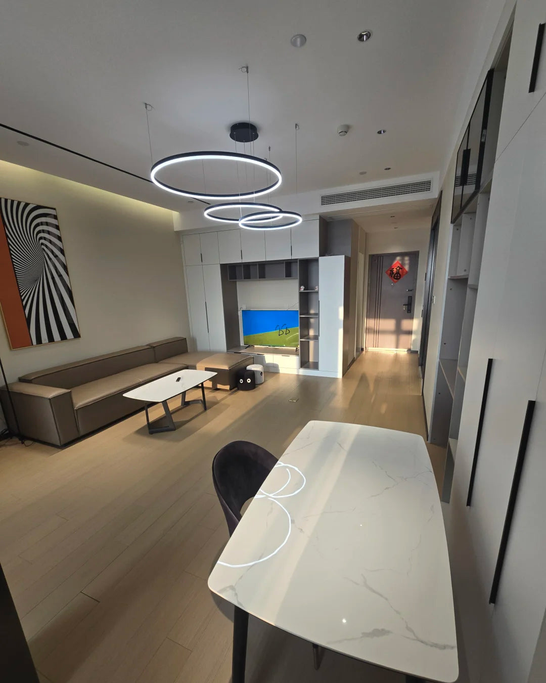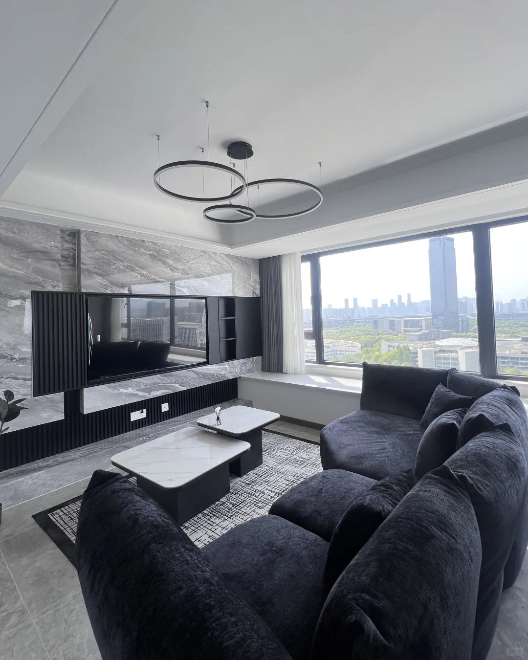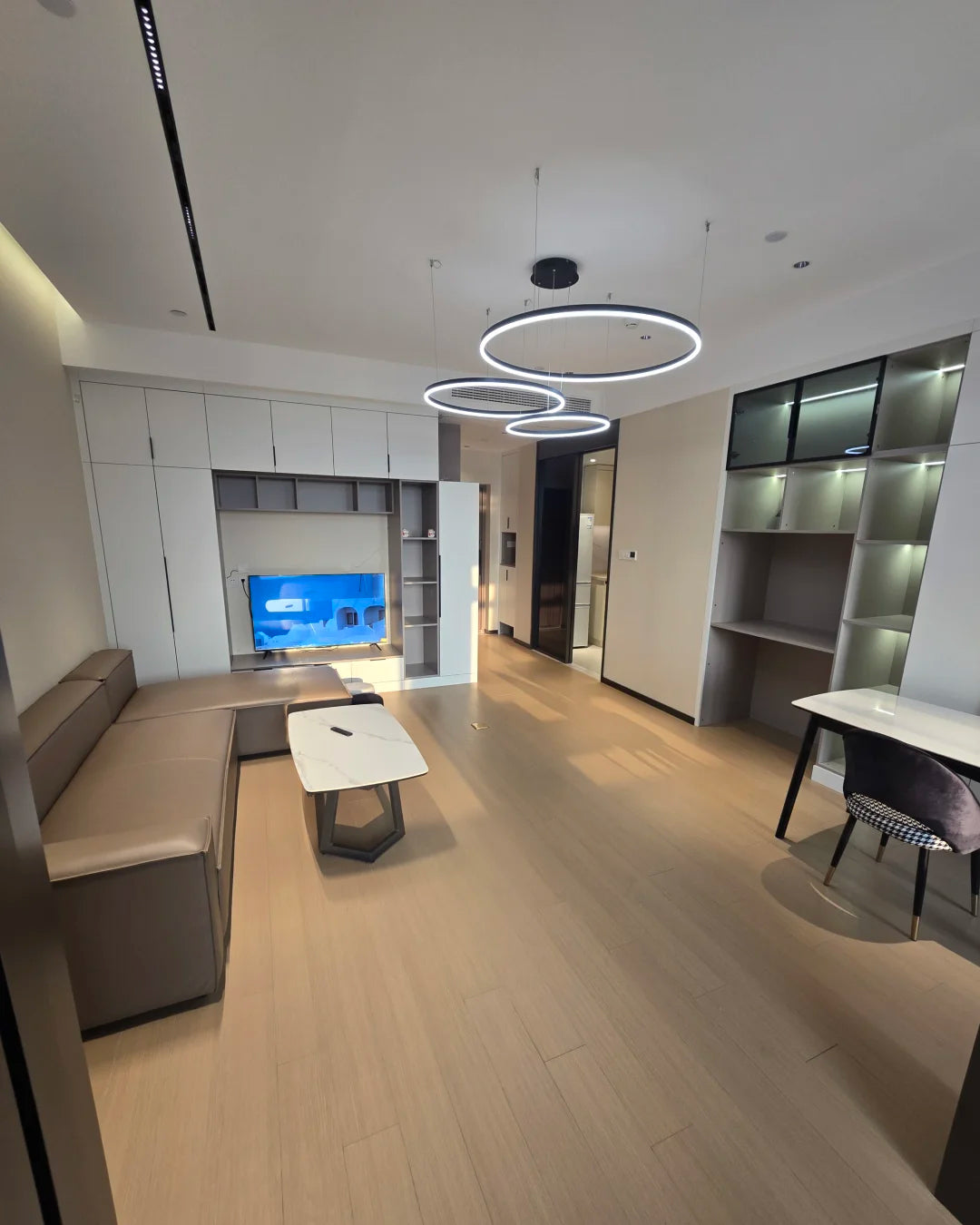 The lights in the pictures are modern circular pendant fixtures with multiple rings suspended from the ceiling. Made of metal with finishes like matte black, brown or gold, the rings are illuminated by integrated LED lights, creating a sleek, glowing effect. These fixtures add a contemporary, geometric touch to any modern space.