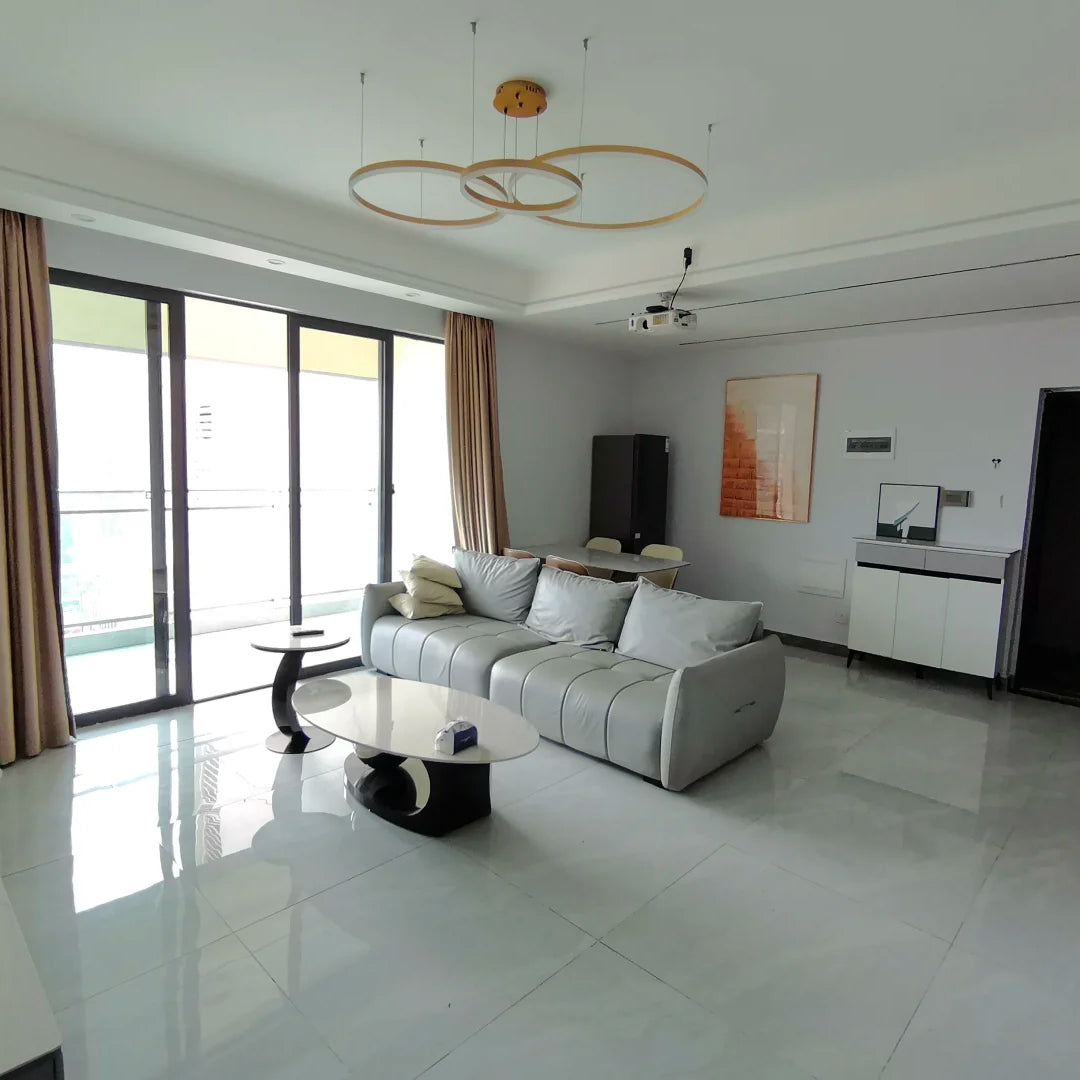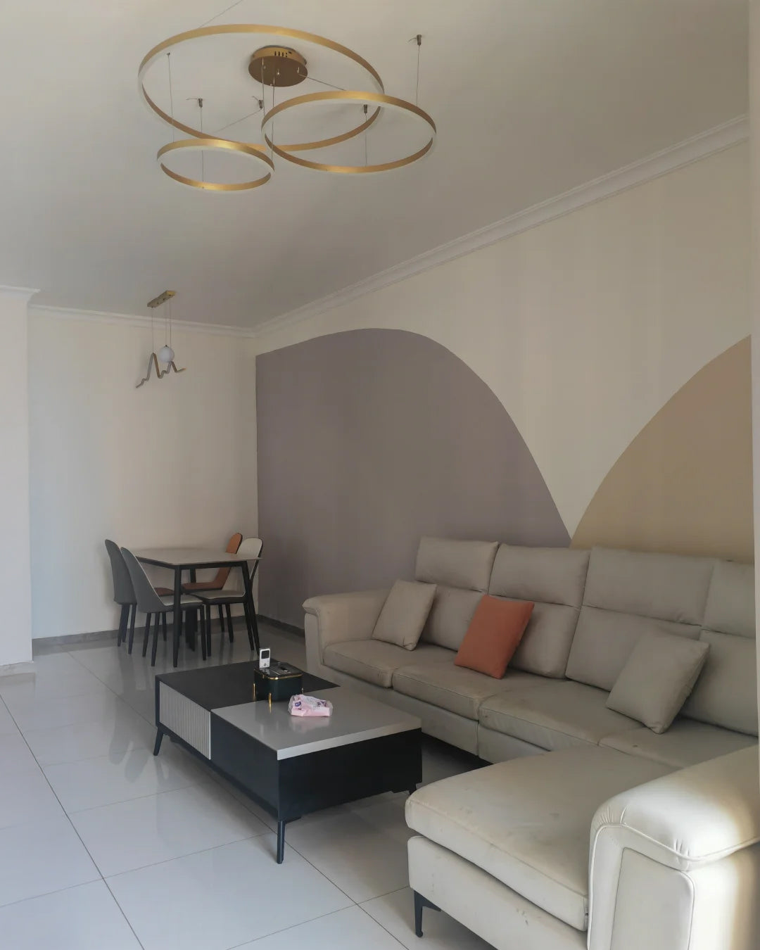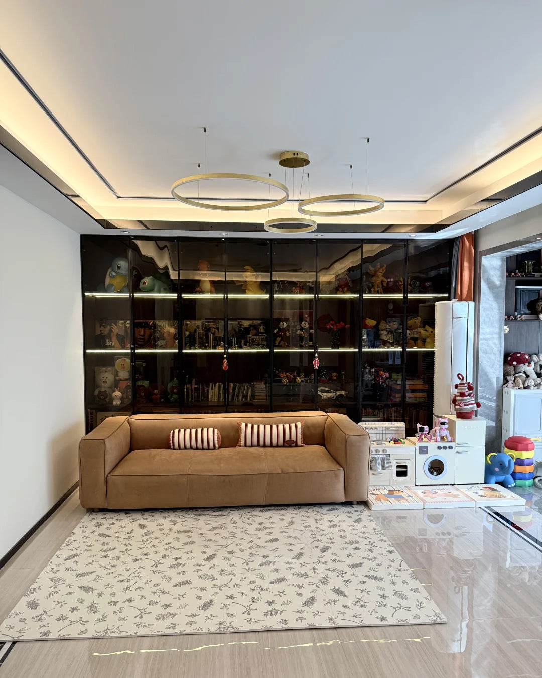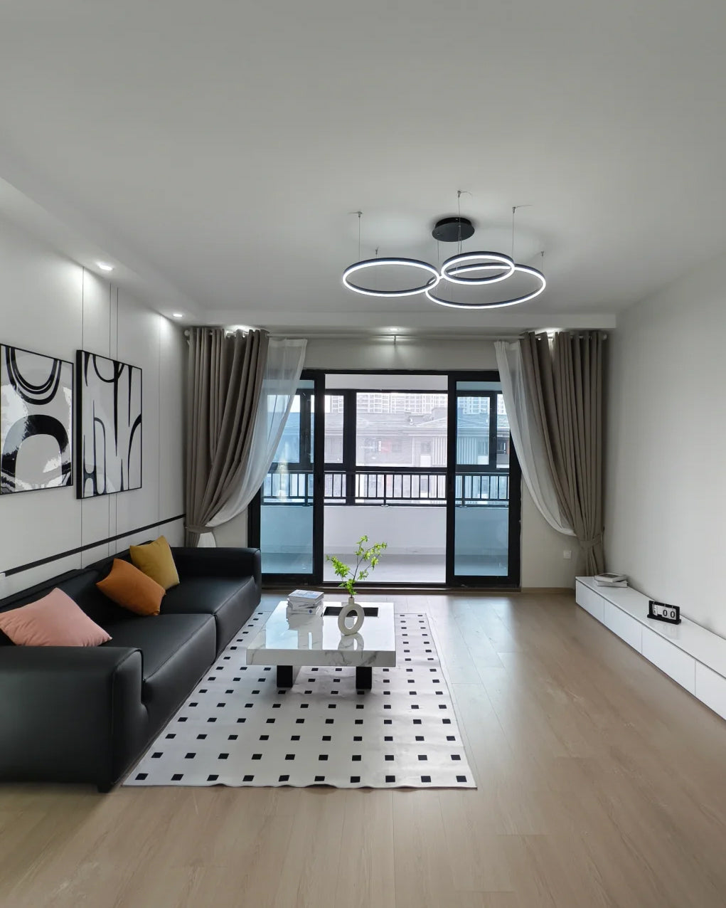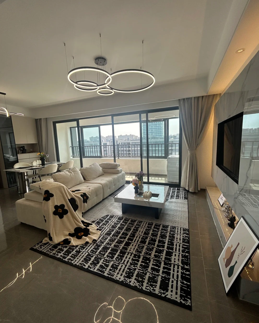 The lights in the pictures are modern circular pendant fixtures with multiple rings suspended from the ceiling. Made of metal with finishes like matte black, brown or gold, the rings are illuminated by integrated LED lights, creating a sleek, glowing effect. These fixtures add a contemporary, geometric touch to any modern space.